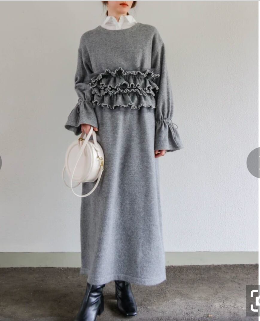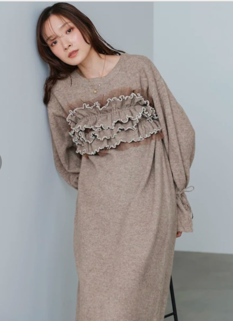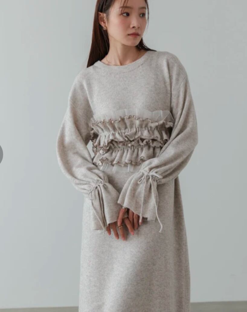チュール×フリル×ニットの異素材ミックスが目を惹く、ビスチェセットニットワンピース。柔らかなニット素材のワンピースに、フリルデザインのビスチェを重ねたようなセットデザインで、1枚で旬のレイヤードスタイルが完成します。ビスチェはキャミタイプではなく、肩まわりをすっきり見せるフリル仕様。フリルにチュールが重なり、やわらかな華やかさを演出します。袖口にはリボンがあしらわれ、キュッと結ぶことでふんわりと広がるシルエットに。モカ・ベージュ・チャコールの落ち着いたトーンで、可愛らしさの中にも大人の上品さを感じさせる着映えワンピです。