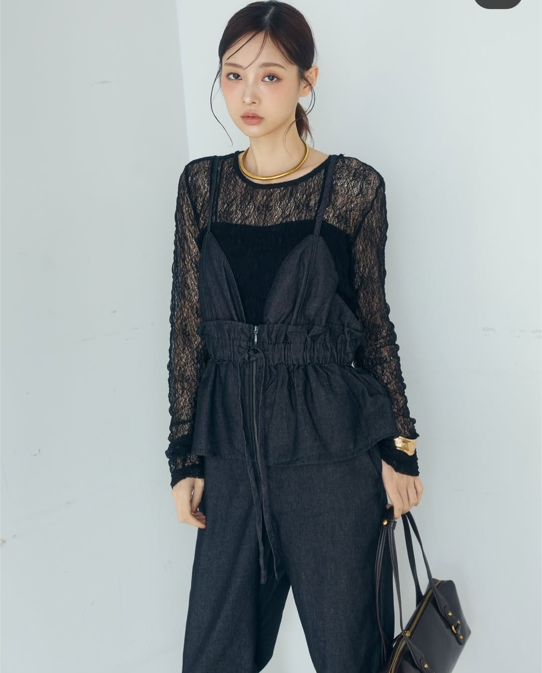 ペプラムフリルが目を引く、今っぽさ満点のデニムコンビネゾン。フロントジップ仕様で着脱もスムーズ、実用性も兼ね備えています。