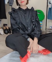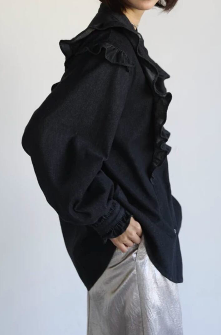 ライトオンスデニムのフリルシャツは、インディゴはケミカル加工、ブラックはワンウォッシュ仕上げの異なる風合いが魅力。前後に施された立体的なフリルが印象的で、デニム特有のヴィンテージ感がコーディネートに深みをプラスします。