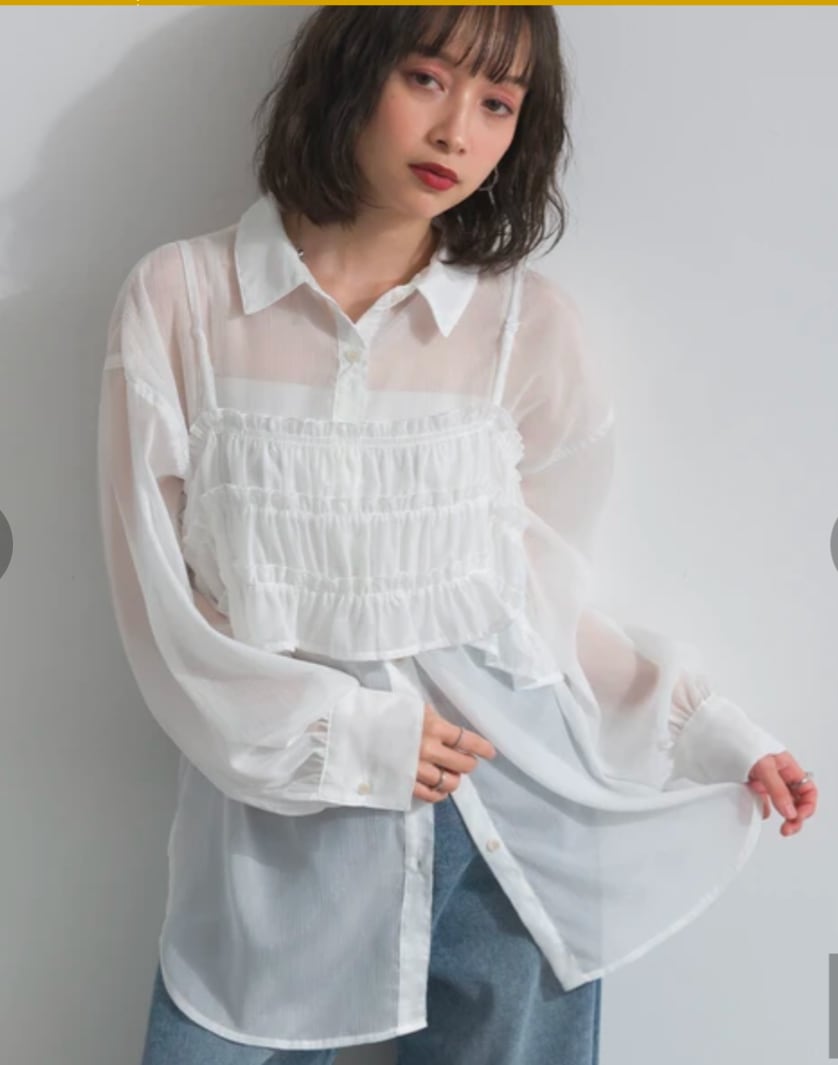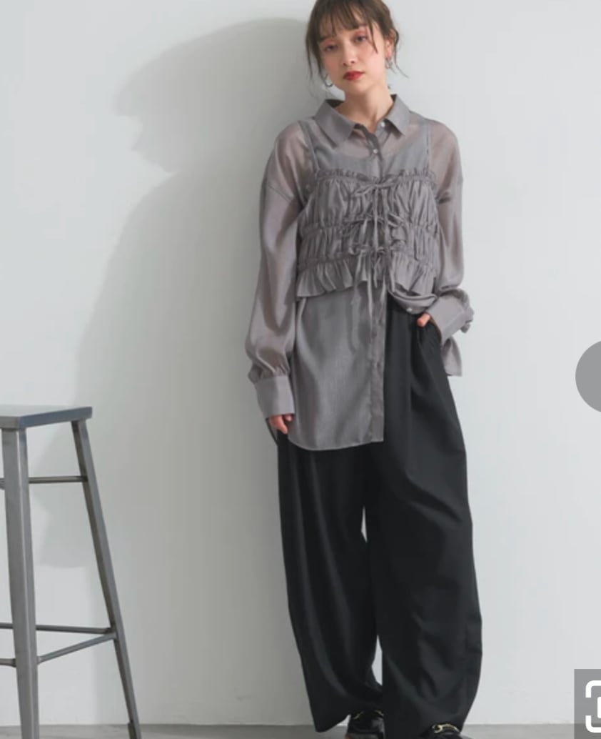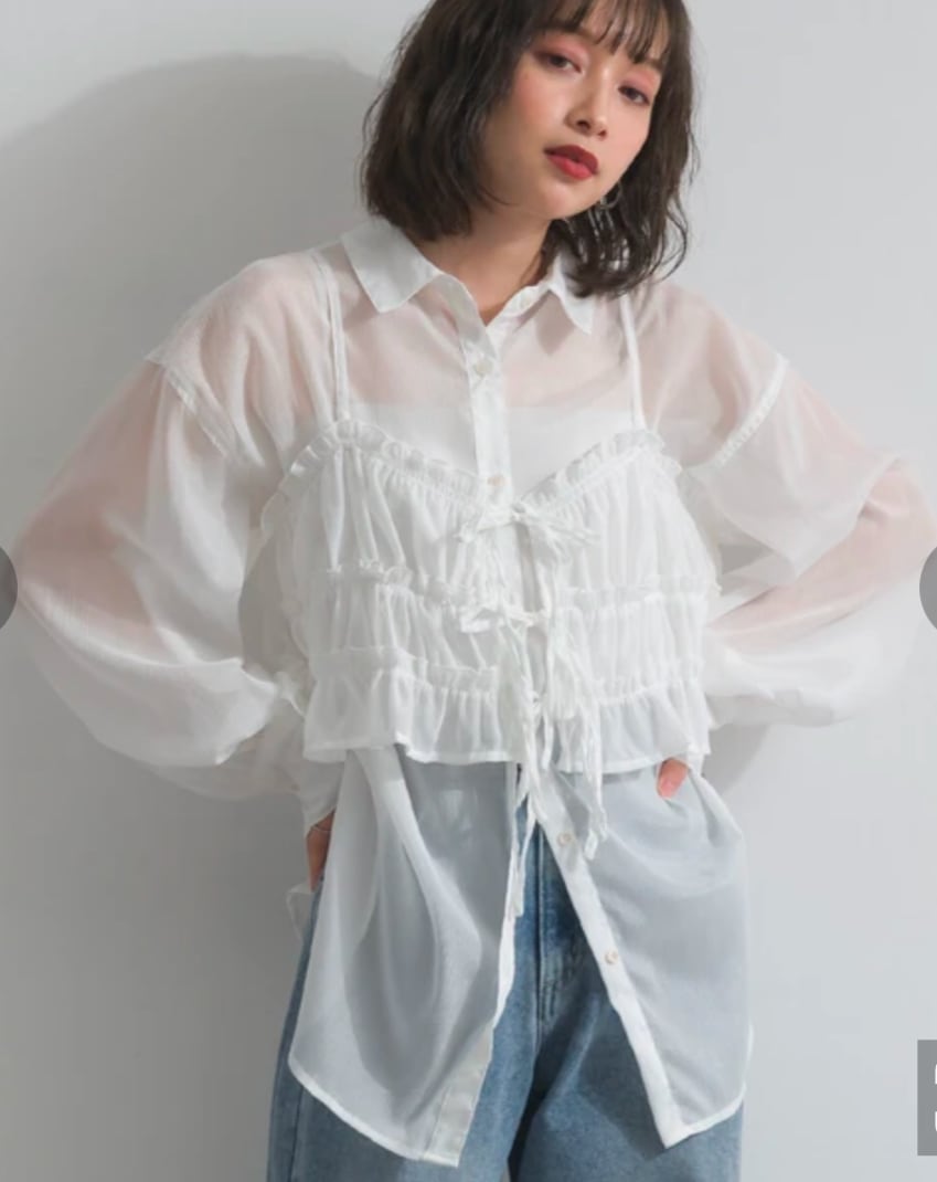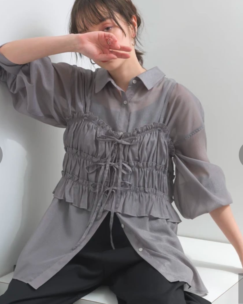 さりげないラメがきらめくシアー楊柳素材を使用した、シャーリングフロントリボンビスチェとシャツのSETアイテム