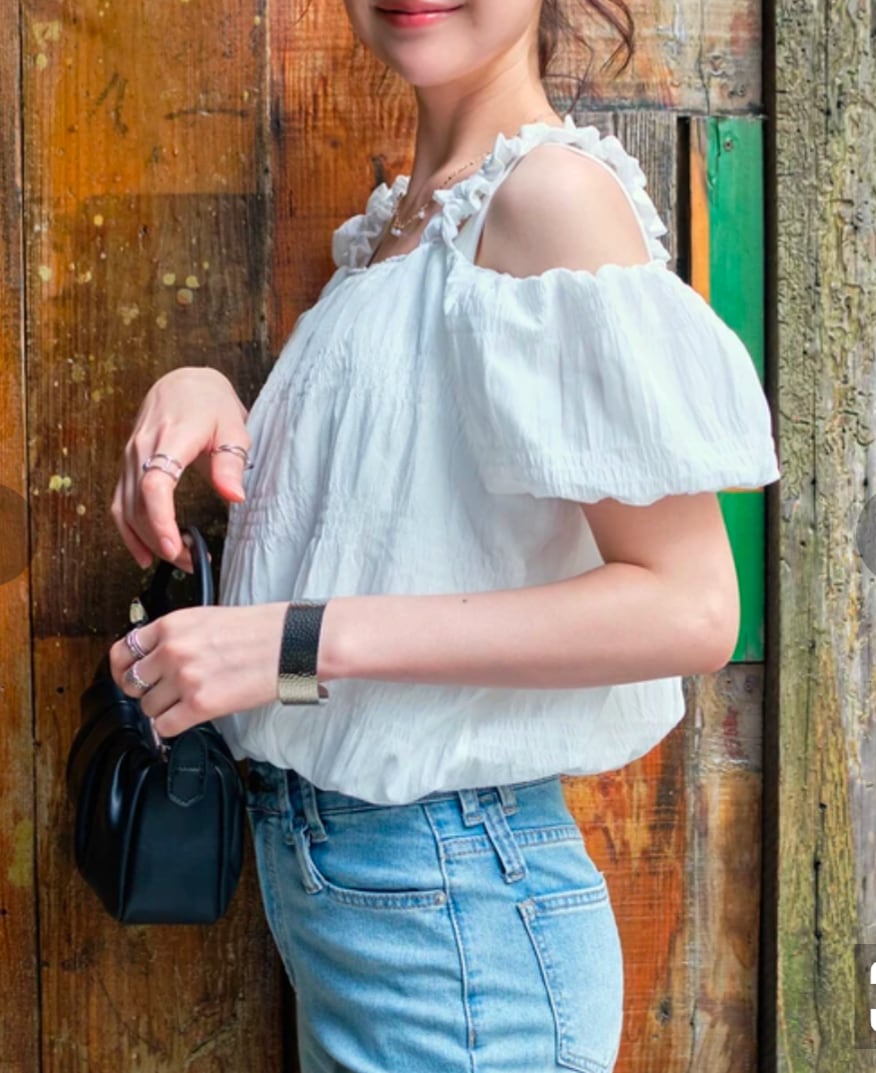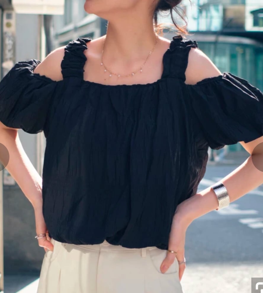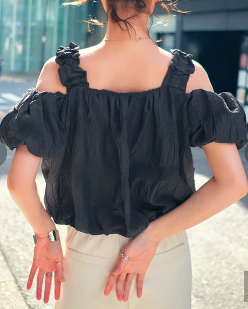 オープンショルダーデザインバルーンヘムブラウス