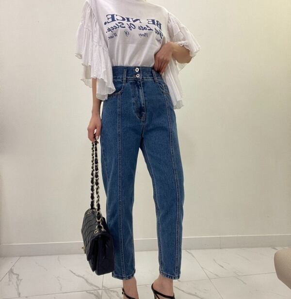 ハイウエストで足がキレイに見えるテーパードタイプのデニムです。