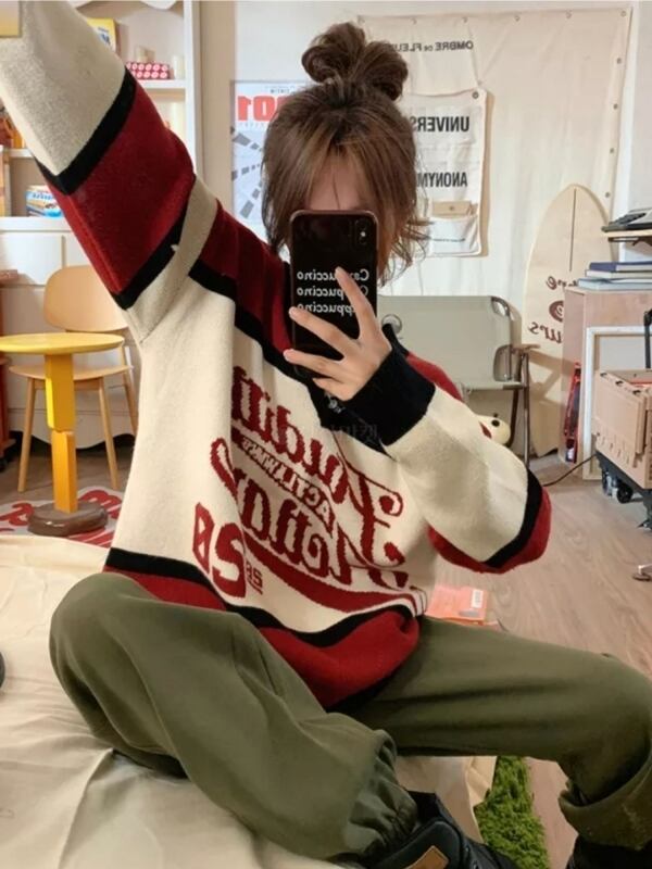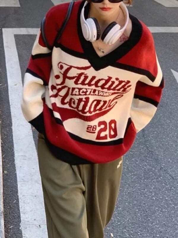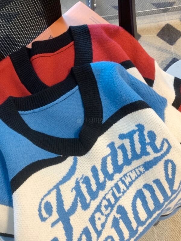 2トーンの配色とロゴがかわいいニット♡vネックなのでシャツをインにしたりしてもかわいいです。