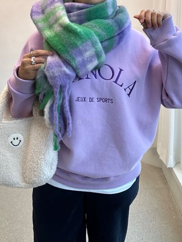 今から春に向けて活躍するアイテムです。薄紫に紫色の刺繍がオシャレなデザインです。