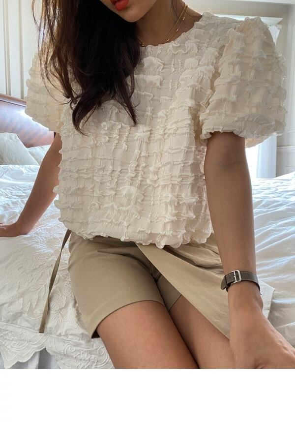 ぽこぽこがかわいいトップス♡パフスリーブでさらに可愛さ倍増です。裾はゴムで少ししぼってあるので着たときに丸い形もポイントです。