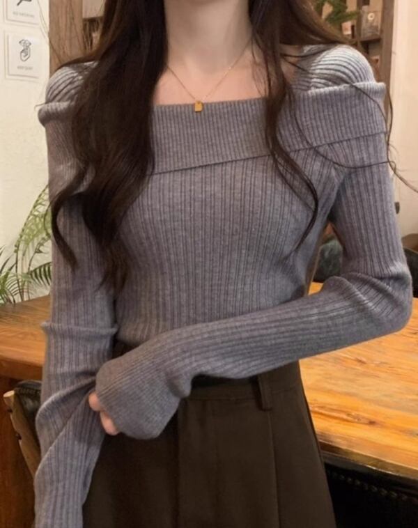 スクエアネックリブニットトップス